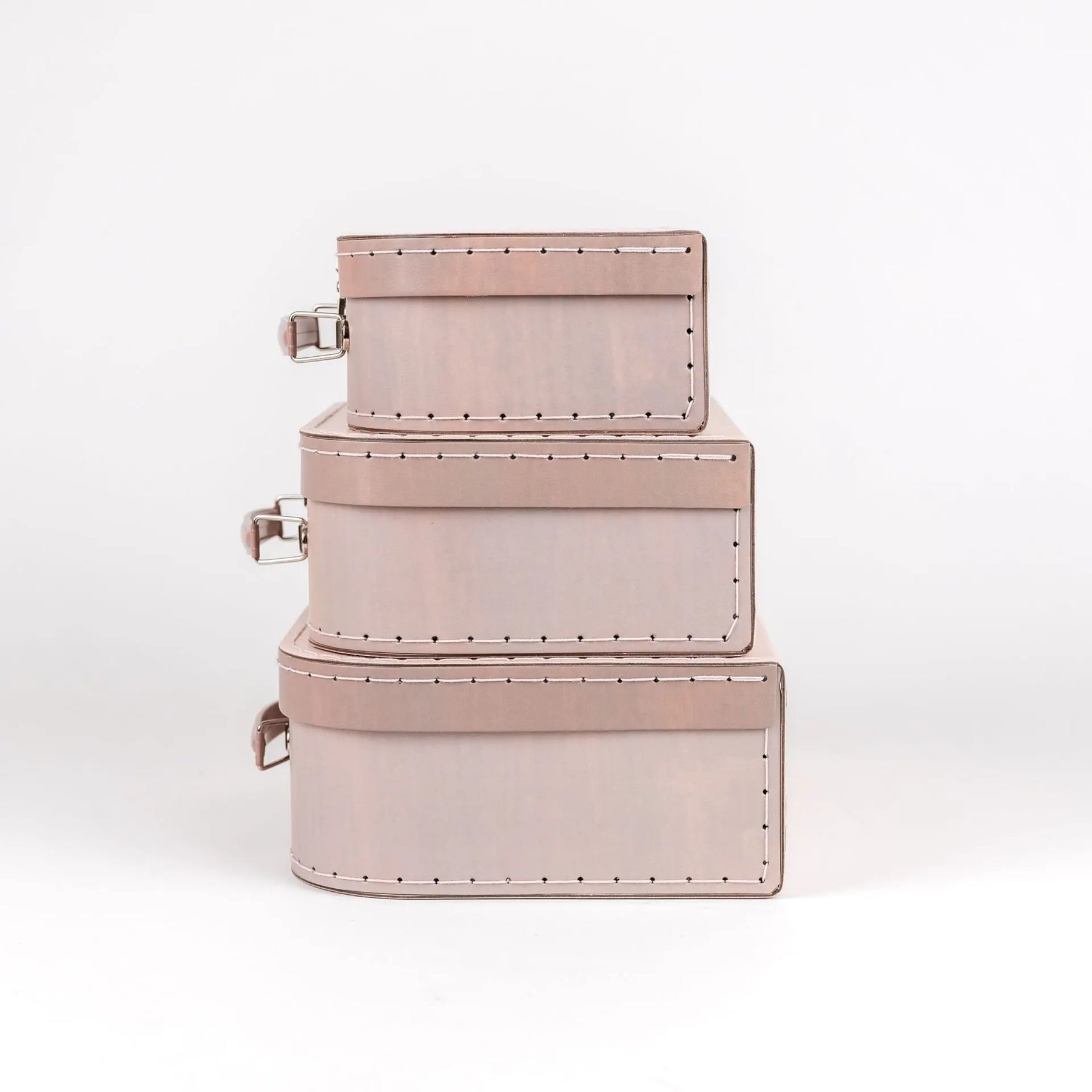 Hand-sewn cardboard cases nest perfectly together, teaching little ones about size and organisation. Sturdy metal latches and neat stitching ensure these beautiful cases last through countless play sessions.