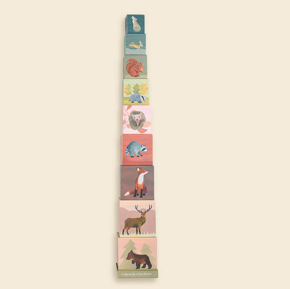 Stack nine soft-painted forest friends into a wobbly tower, then watch them tumble down with giggles. Each cube hides a different woodland animal—from tiny hare to gentle bear.