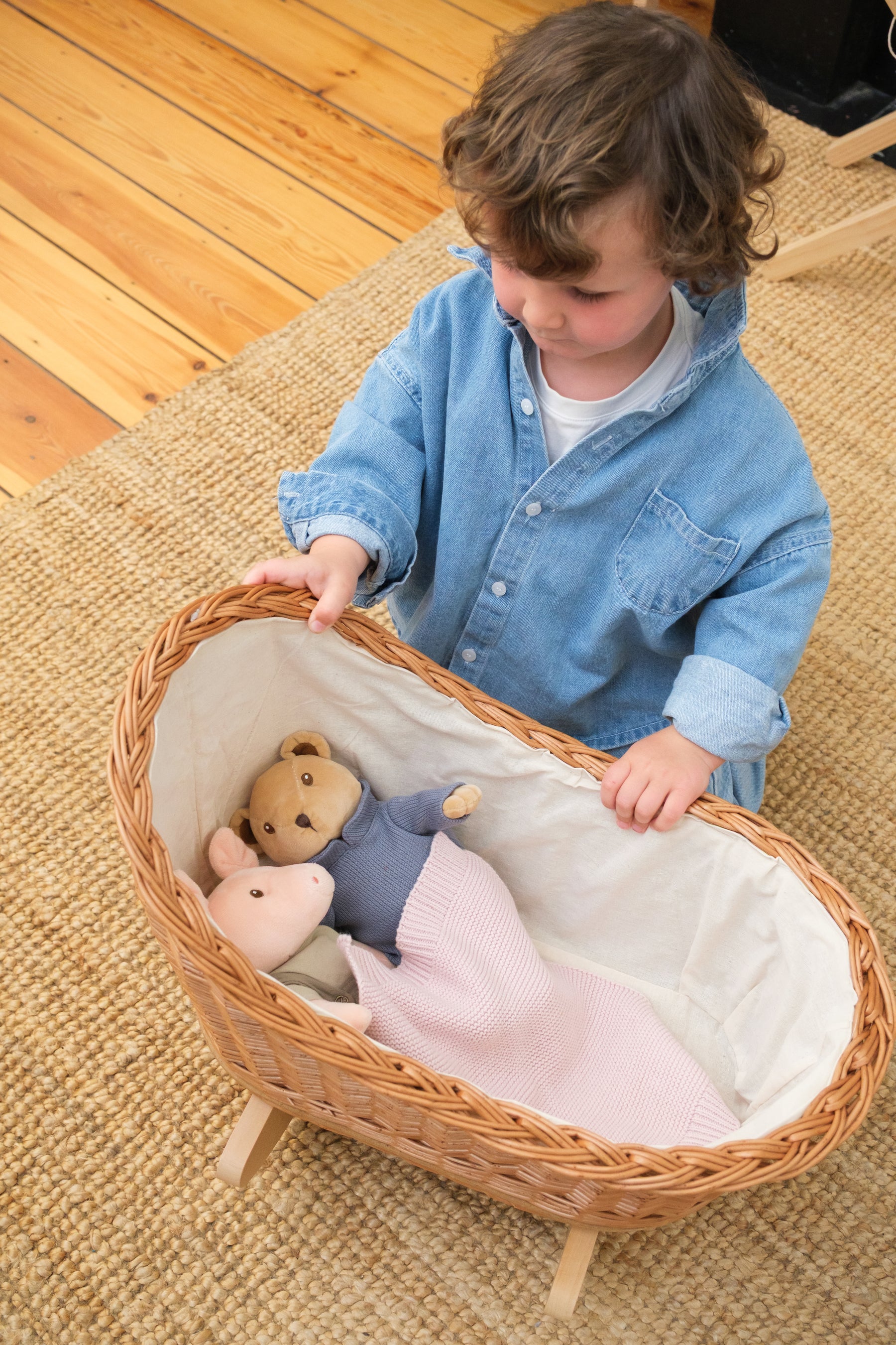 Little hands learn nurturing care through pretend play. Hand-woven natural wicker feels wonderfully smooth, whilst the removable fabric liner keeps everything tidy and fresh.