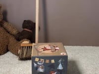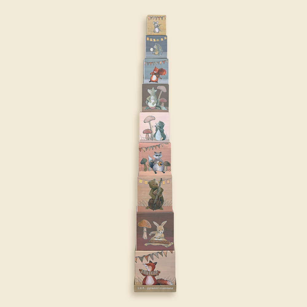 Stack eight delightful boxes into a towering pyramid, then watch little ones discover a woodland orchestra hiding inside. Each soft-coloured block reveals charming animal musicians—from a fox with his ruff to a tiny mouse with musical props.