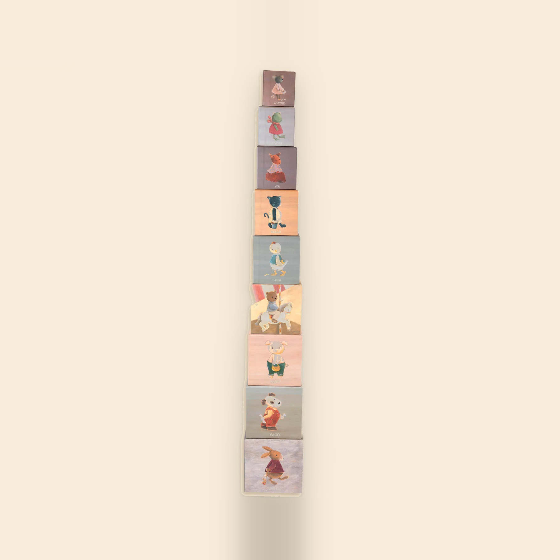 Stack nine cubes into a wobbly tower, then watch it tumble down with giggles. Each cube reveals a gentle animal friend—Agathe the mouse, Billie the frog, or Lenny the rabbit—waiting to spark stories and adventures.