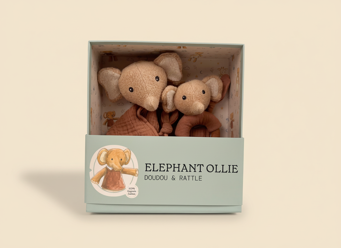 Two little Ollie companions arrive together in one thoughtful gift. The crinkly muslin doudou becomes baby's first comforter, whilst the soft rattle turns tiny moments into delightful discovery. Different textures and a gentle chime help build grasp, touch and curiosity from the very first days. Both toys are crafted from bio cotton with hand-embroidered features and safely rounded seams. Beautifully presented in giftable packaging, ready to be unwrapped. A heartfelt welcome for a new baby or a cherished baby shower surprise.