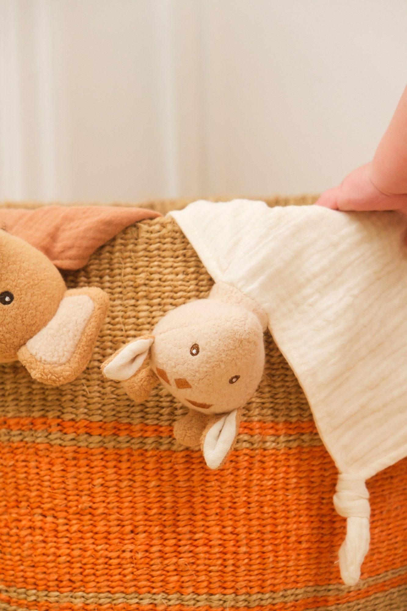 Leonie arrives as a pair of sweet companions in one thoughtful gift. The crinkly muslin doudou becomes baby's first comforter whilst the soft rattle brings a gentle chime to tiny moments of play. Different textures and sounds help develop touch, grasp and calm curiosity from the earliest days. Both pieces are crafted from bio cotton with hand-embroidered features and rounded seams. Beautifully presented and ready to be unwrapped. A heartfelt welcome for a new baby or a treasured baby shower gift.