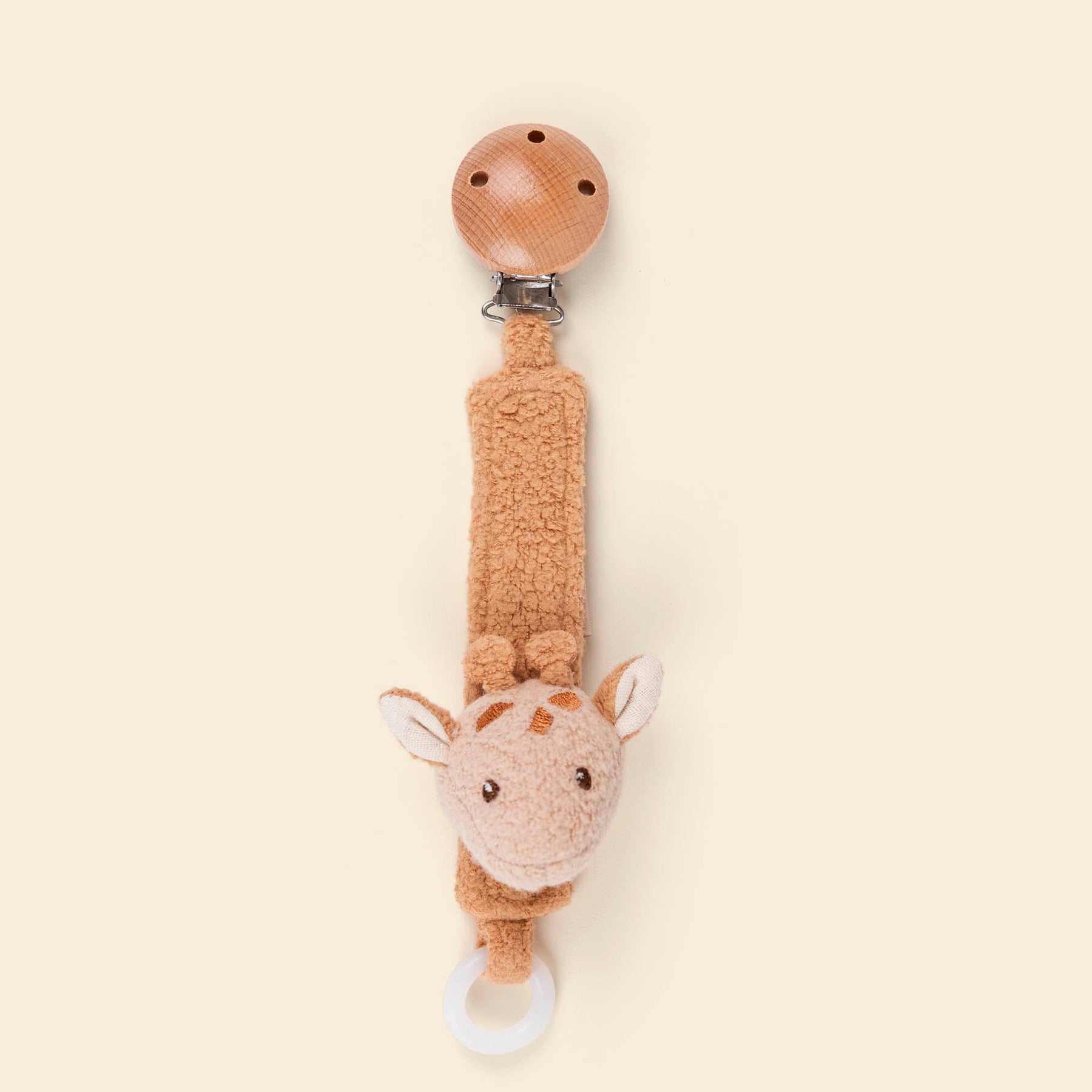 Little hands reach for the soft giraffe friend, turning everyday moments into gentle adventures. The warm wooden clip keeps pacifiers close whilst baby explores.