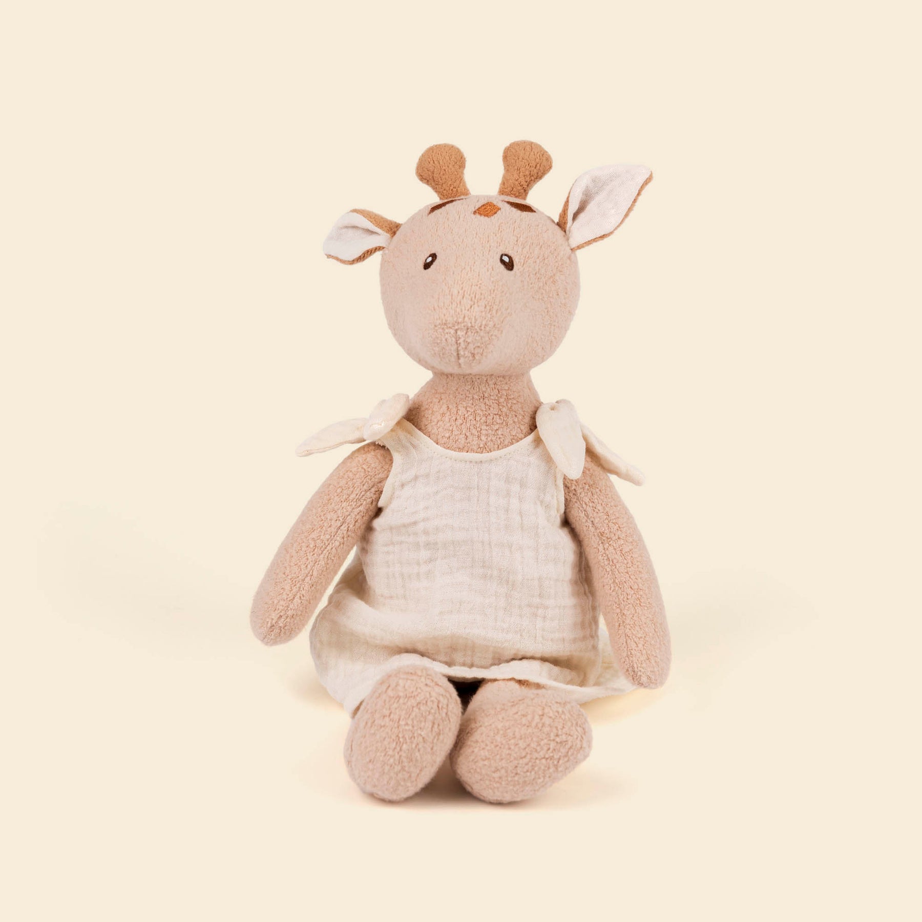 Made from textured boucle plush, she encourages nurturing play whilst developing caring skills. Hand-embroidered features and knotted muslin dress straps show thoughtful craftsmanship. Safe for babies with no small parts.