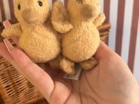 Two little ducklings sit quietly, then suddenly one opens its eyes whilst the other dreams peacefully. Soft peach plush feels wonderfully cuddly in tiny hands.