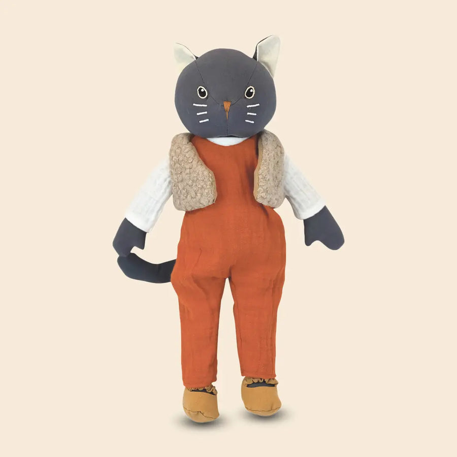 This soft gray cat loves getting dressed up for adventures. His cosy overalls and cable-knit jumper make every cuddle feel extra special.