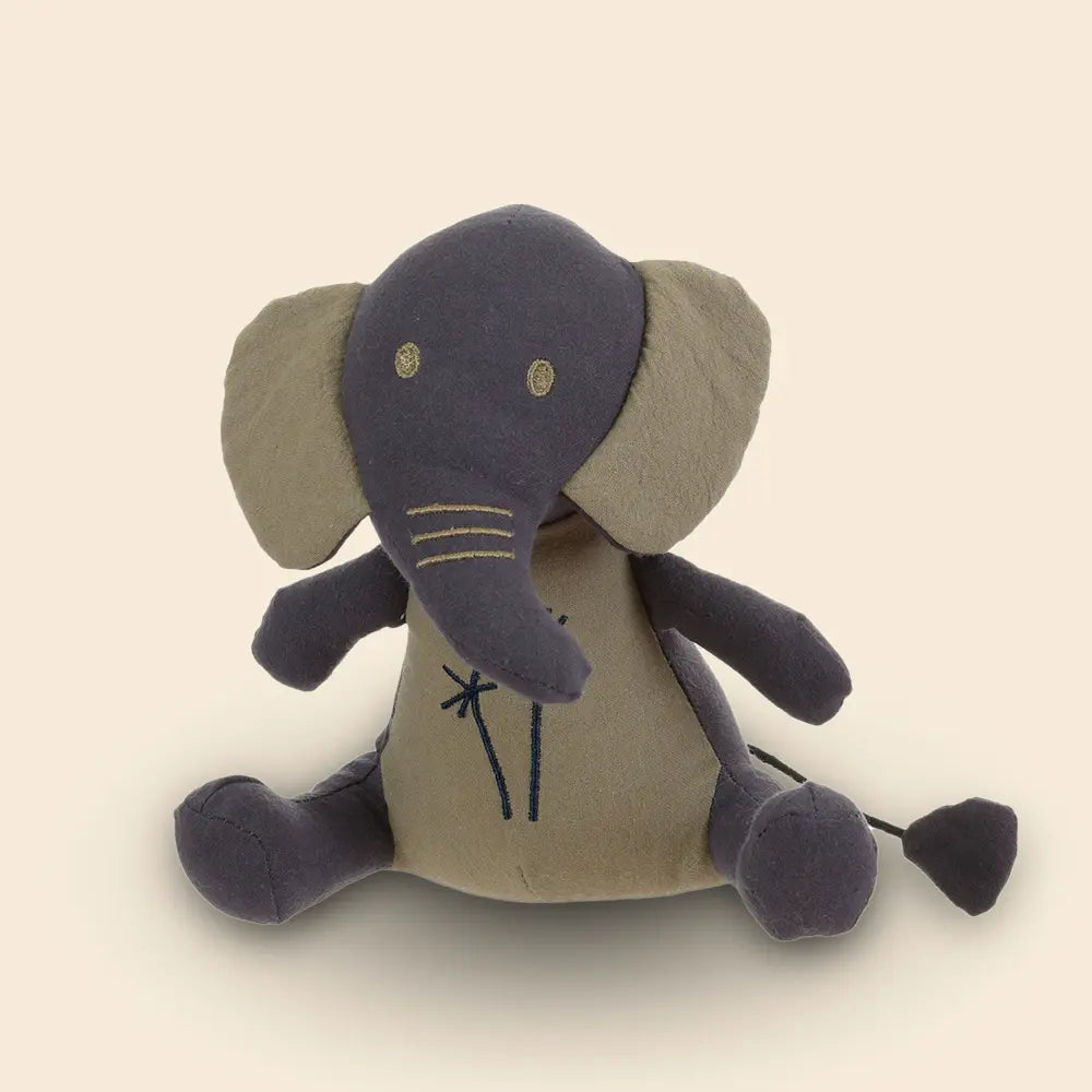 Little ones learn about animals whilst enjoying beautifully embroidered details—from her delicate trunk lines to the sweet botanical motif on her belly. Hand-finished stitching gives each toy a lovingly crafted touch.