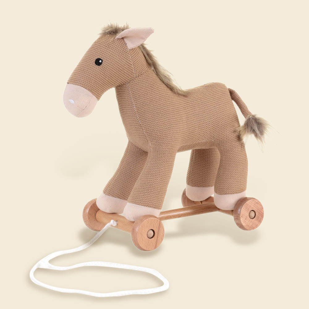 Little legs toddle across the room, pulling their soft horse friend behind. The gentle rumble of wooden wheels turns every step into an adventure.