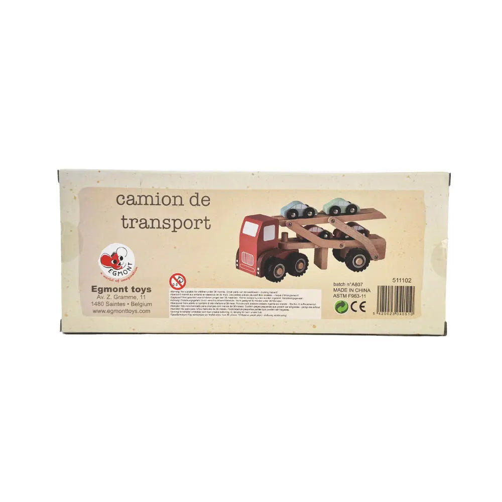 Load up the smooth wooden trailer, lift the top deck, and watch little cars roll into place. Ordinary transport becomes a bustling delivery adventure with four colourful cars ready to travel.
